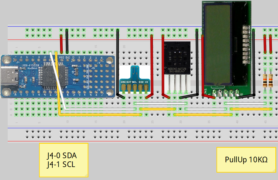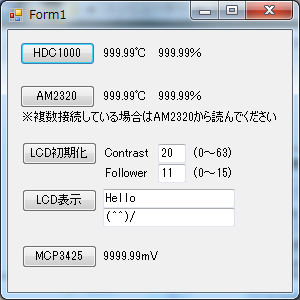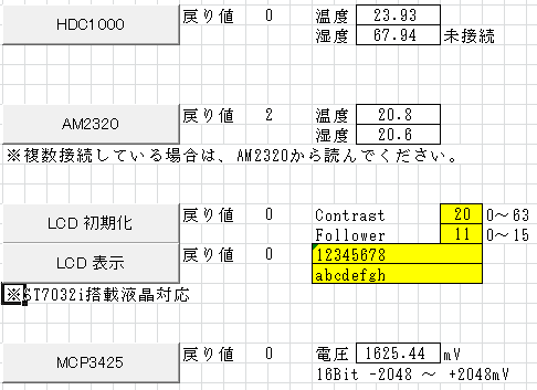 USB-IO Family I2C (2023/04/23)TypeCコネクタ基板はマイコン変更のため、接続ピンがJ4になりました。 接続方法 10KΩでプルアップし、J4-0SDAとJ4-1SCLを接続します。 (旧MiniBコネクタの基板はJ2-0SDAとJ2-1SCLを接続) ![]() (拡大) 通信手順 I2Cを利用して、センサー等から情報を取得するには下記基本的には下記手順でコマンドを送信しデータ取得します。 I2Cマスタープン ↓ I2Cデータ書込み ↓ I2Cデータ読込み ↓ I2Cクローズ MCP3425 16Bitアナログ入力の場合のコマンド例はこちら データの書込み・読込みのシーケンスについては利用するセンサー等のデータシートを参照して下さい。 設定 I2C接続を利用するには、以下の設定にしてください。 ・内臓プルアップ無効 ポート4 ・入力ピン ポート4ピン0,1を 1(入力設定) ・出力初期設定 ポート4ピン0,1を 0 デフォルトの設定状態で利用可能です。 設定アプリはこちらです。 サンプルアプリケーション 「簡単!USBで電子制御」付属のDLLにI2C機能を追加しました。 ダウンロードはこちらから。(書籍購入者は無料です) サンプルとして、温湿度計(HDC1000,AM2320) 液晶(ST7032i) A/D変換(MCP3425)を用意 ExcelVBASample.zip内のtestExcel2010I2C.xlsm ![]() SRC.zip内の16_I2C\16_I2C.sln ![]() |