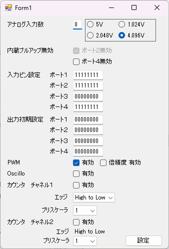 USB-IO Familyは設定を変えることで様々な機能の利用が可能です。 機能が膨らんできましたので、書籍に掲載している設定サンプルを改良しました。 VisualBasic2010と制御DLLを使って作成しています。 設定アプリダウンロード (旧32Bit版) (2023/04/21) USB-FSIO30のTypeC基板はアナログ入力の参照電圧が選べるようになりました。 (2017/02/04) 倍精度PWMの設定を追加しました。倍精度PWMを有効にすると通常のPWMは利用できません。 (2012/04/10) 簡易オシロ機能の設定を追加しました。簡易オシロ機能を利用の場合はOscilloを有効にしてください。 使い方