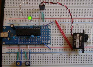可変抵抗を動かす事で、サーボが動作したりLEDの調光ができます。